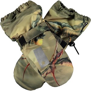 Green winter mittens with a dinosaur print. There is a black rubber coating on the inside of the palms and on the thumbs for easy gripping. The mittens are great for all kinds of weather and perfect for ski trips. The colours and prints of these mittens match Molo's outerwear. On this model, the shaft is a bit longer than Mitzy, so there is no gap between the mittens and the jacket sleeves. Size 1-2 years has a zipper in the cuff instead of the Velcro strap.