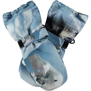 Blue, waterproof and breathable mittens with polar bear print and 3M™ Thinsulate™ insulation. The mittens have a reflector on the front, as well as elastic and adjustable Velcro at the wrist. Please note that the cuff on this model is slightly longer than on Mitzy, so there is no opening between the mittens and the jacket sleeve. Features: Water-repellent PFC-free impregnation Water column pressure: 15,000 mm. Breathability: 15,000 g/m2/24h 3M Thinsulate TM insulation Please note that size 1-2 years has a zipper in the cuff instead of Velcro closure.