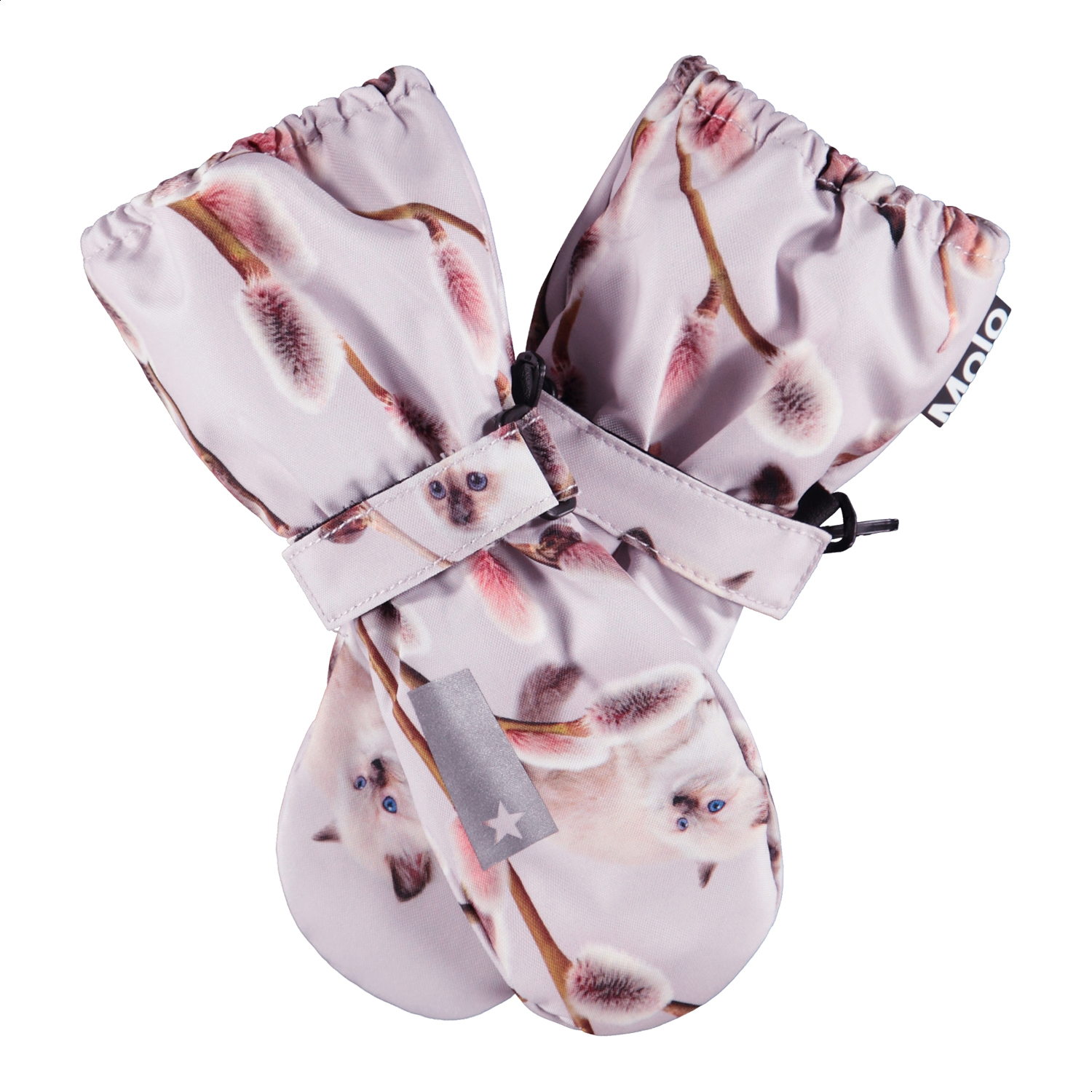 Light grey waterproof and breathable mittens with cat print, fleece lining and 3M™ Thinsulate™ insulation. The mittens have a reflector on the front, as well as elastic and adjustable velcro at the wrist. Note that the shaft on this model is slightly longer than on Mitzy, so that there is no opening at the jacket sleeve.
