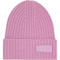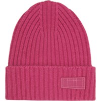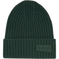 Dark blue ribbed knit beanie with roll up and Molo's logo on the front.