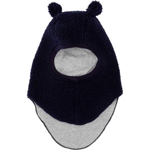 Dark blue balaclava with cute teddy bear ears for babies and toddlers. It is in soft teddy fleece and is perfect for keeping the neck, head, and ears warm on chilly days. The balaclava is lined with soft grey melange jersey lining.
