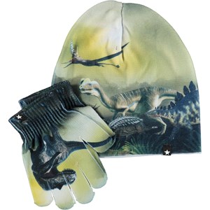 Matching set of hat and gloves with a print of various dinosaurs. S/M: 3-6 years. M/L: 7-12 years.