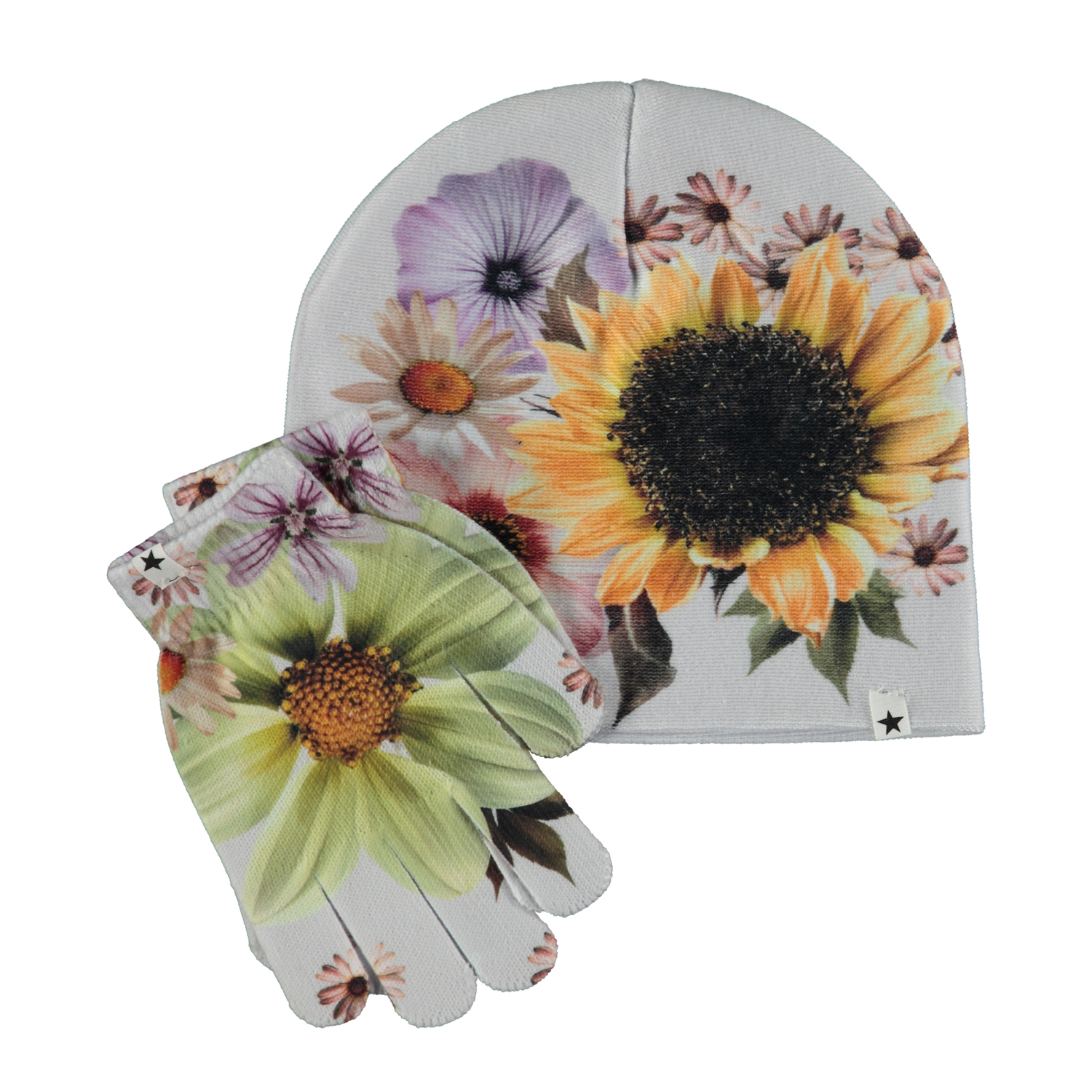 Matching set of hat and gloves in floral print. Size S/M 3-6 years. Size M/L 7-12 years.
