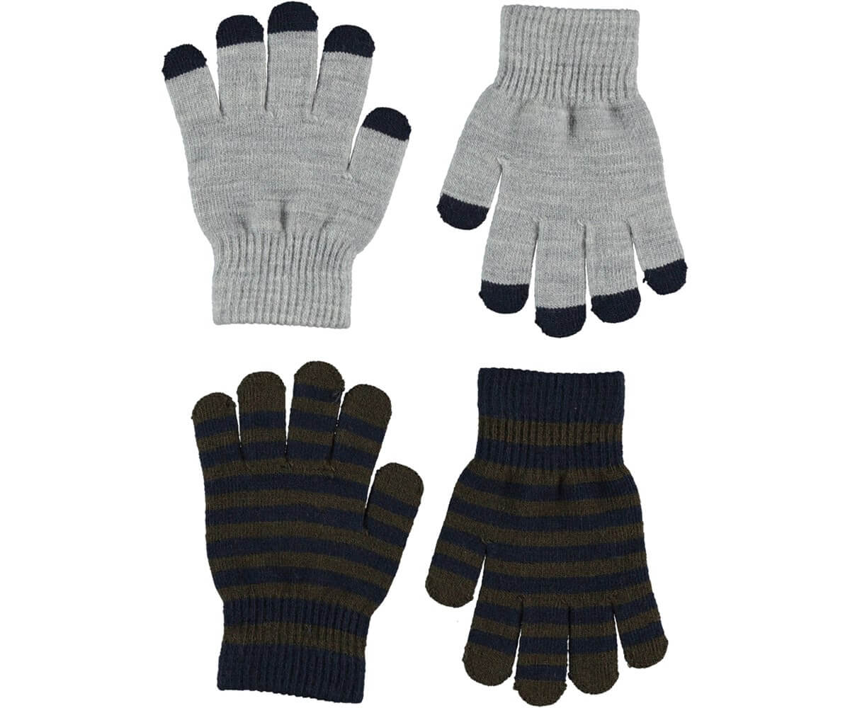 Two pair knit gloves. One pair is grey with black finger tips, while the other is striped in blue and green.