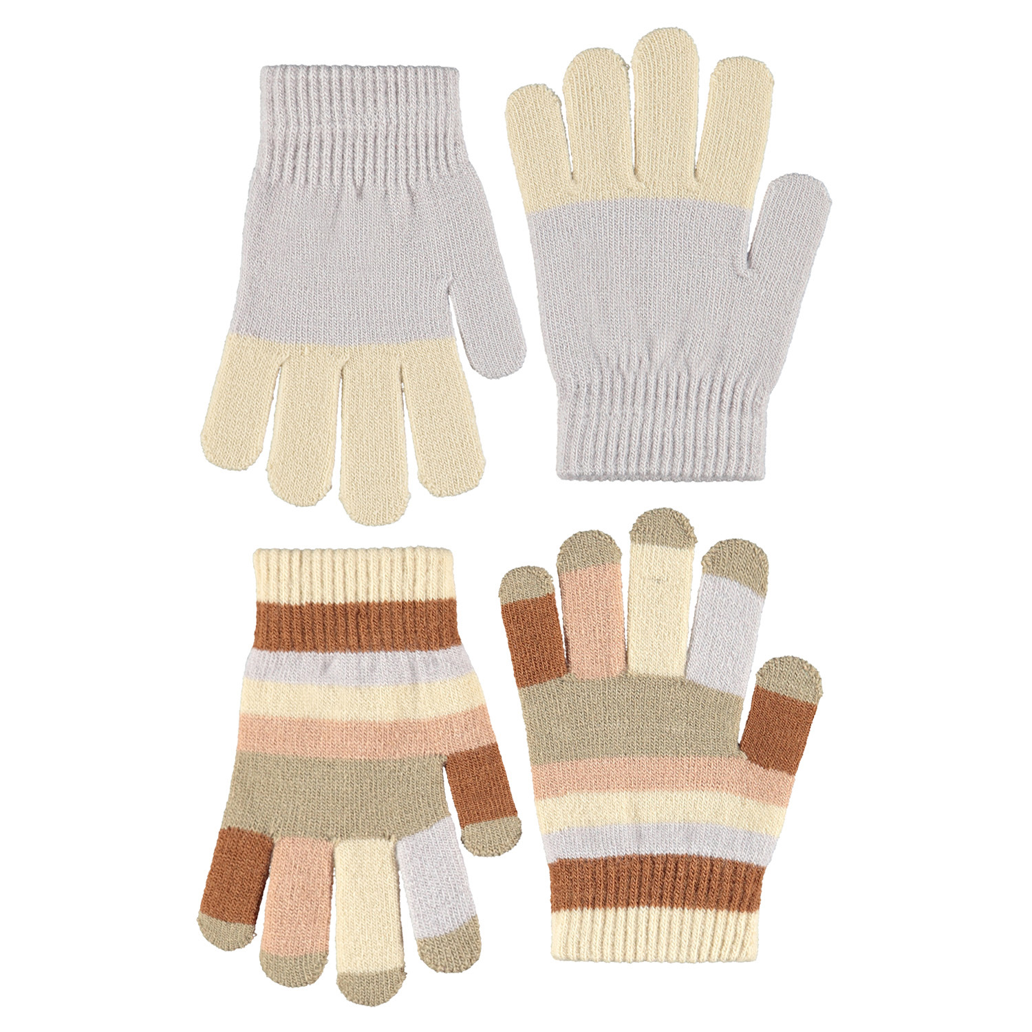 2-pack of knitted gloves in brown, grey, rose, and beige shades. The gloves have a ribbed cuff around the wrist that makes them comfortable to wear and prevents them from slipping off the hand.