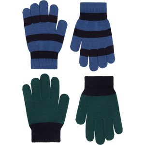 2-pack of knitted gloves. One pair is petroleum green with black details, while the other pair is striped in black and blue. The gloves have a ribbed cuff around the wrist, making them comfortable to wear and preventing them from slipping off the hand.