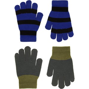 2-pack of knitted gloves. One pair is khaki coloured, while the other pair is striped in black and navy blue. The gloves have a ribbed cuff around the wrist, making them comfortable to wear and preventing them from slipping off the hand.