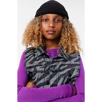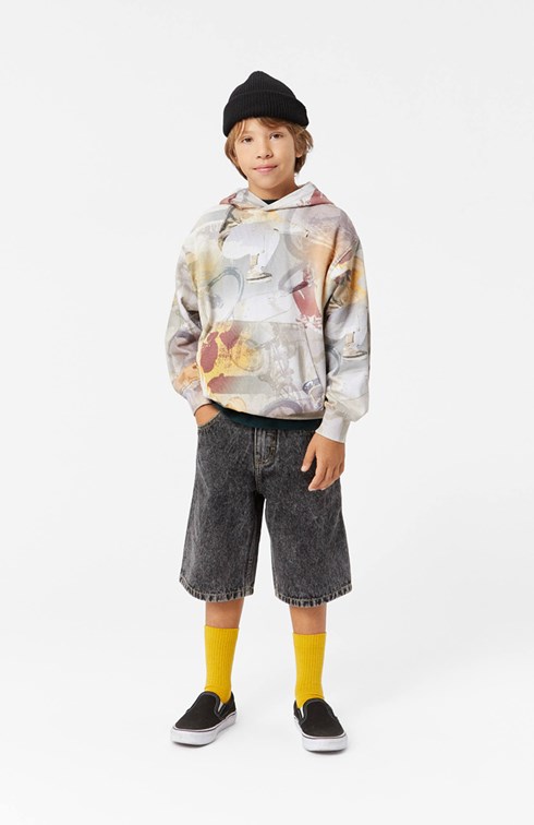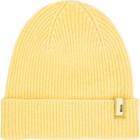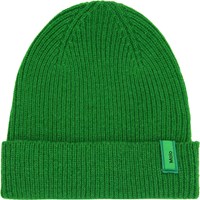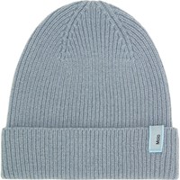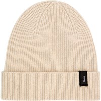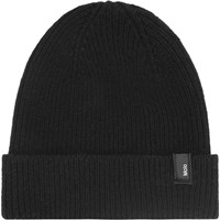 Black rib-knit woolen beanie with Molo's logo on the roll up.