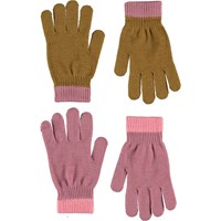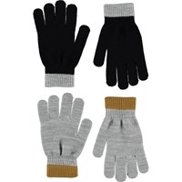 Two pair knit gloves. One pair is in dark blue with green at the wrists, while the other is in green.