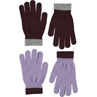 Two pair knit gloves. One pair is in green with a grey knit edge at the wrists, and the other is light purple and grey.