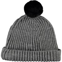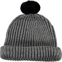 Grey knit hat with roll up and a black faux fur pom pom on top.
