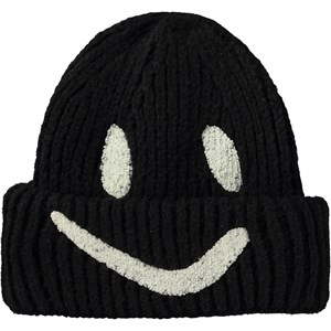 Rib-knit beanie in black with roll up and embroidered smile in white.