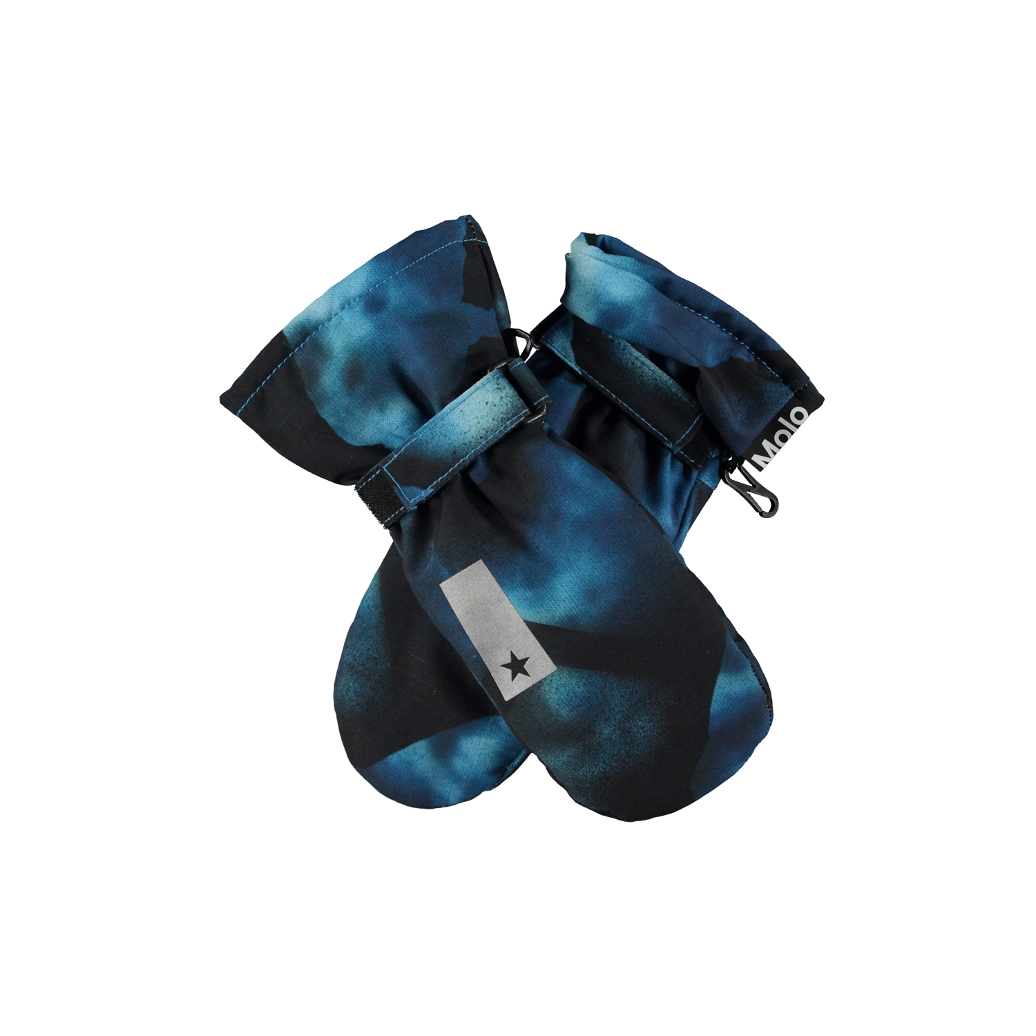 Winter mittens for really cold days in blue with a tie-dye print. There is a black rubber coating on the inside of the palms and on the thumbs for easy gripping. The mittens are great for all kinds of weather and perfect for ski trips. These mittens match the prints and colours of Molo’s outerwear.