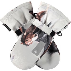 Grey waterproof and breathable mittens with a horse print and with 3M™ Thinsulate™ lining. The mittens have Molo reflectors on the top of the hand. They have elastic and adjustable velcro at the wrists. The outer fabric is made from 45% recycled polyester, the 3M™ Thinsulate™ padding from 78% recycled polyester and the lining from 100% recycled polyester. This product has a water resistant, PFC-free surface treatment (Does not contain, e.g. PFOS, PFOA, etc). Water column pressure: 10.000 mm. Breathable: 8.000 g/m2/24hr. Sizes 1-2 years also have a zip at the cuff.