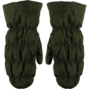 Green, soft and warm mittens that are lined in technical down, called pearl padding, which makes them extra soft, retains heat and has a down-like feel. This product has a water-resistant, PFC-free surface treatment (Does not contain, e.g. PFOS, PFOA, etc). Water column pressure: 5.000 mm. Breathable: 5.000 g/m2/24hr.
