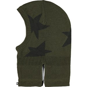 Green ski mask in a soft wool blend with intarsia stars, a soft fleece lining and a dart at the neck so the mask lies better over the chest and shoulders.