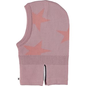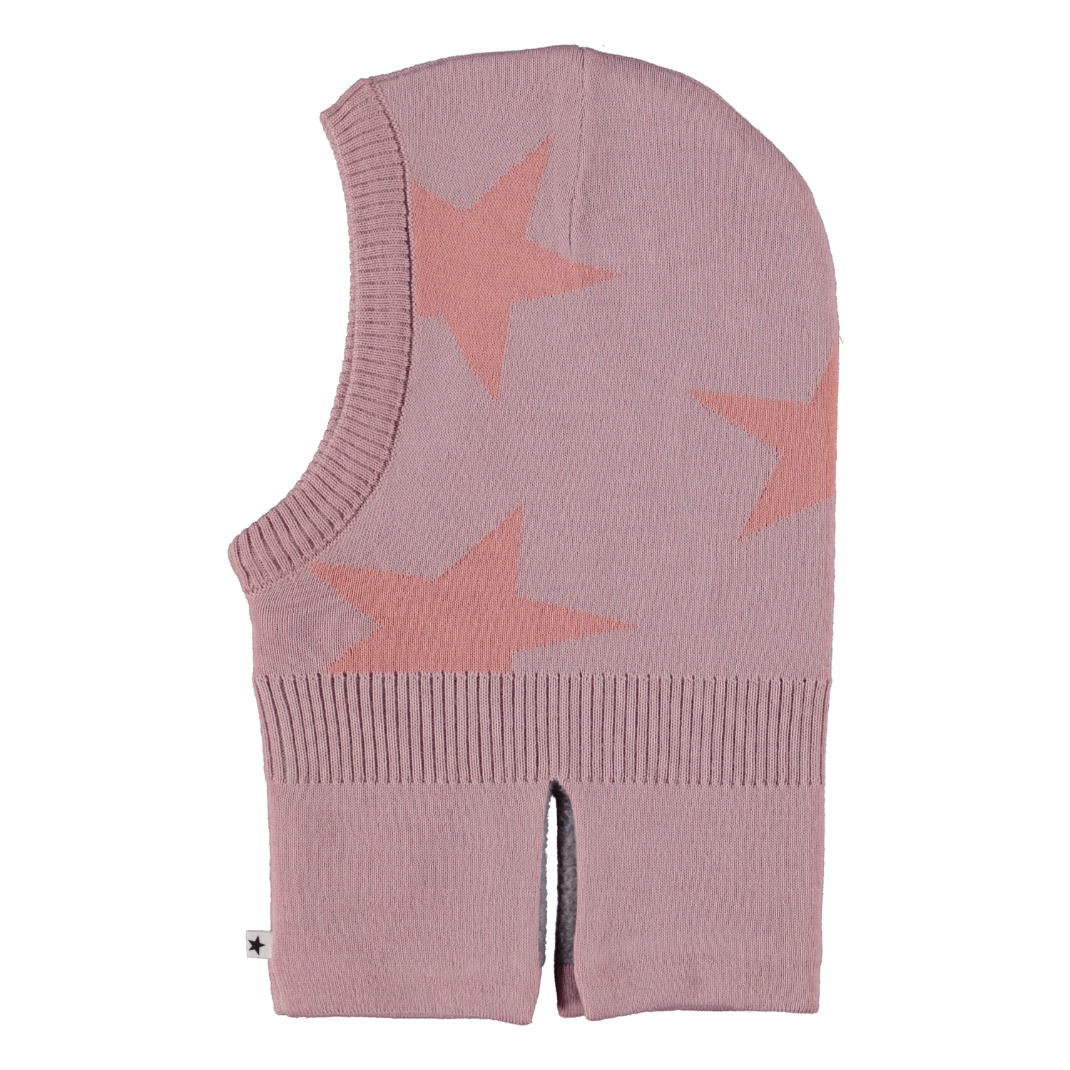 Pink balaclava with intarsia stars. The hat is in a soft wool blend and is lined in fleece. It has slits on the sides of the neck so it fits well over the shoulders and chest.