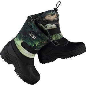 Green winter boots with a dinosaur print. The boots are constructed in functional polyester with an adjustable closure at the leg and a soft rubber sole that continues around the foot. The boots' outer material is 35% recycled and made of recycled polyester. Both the sole and the legs are waterproof. They have an inner, chunky sock in polyester, which makes the boots perfect for warmer as well as colder weather. This product has a water resistant, PFC-free surface treatment (Does not contain, e.g. PFOS, PFOA, etc). Water column pressure: 10.000 mm. Breathable: 8.000 g/m2/24hr.