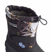 Practical winter boots in black with a flower print and a sturdy and non-slip black sole. The boots have an adjustable elastic at the top of the shaft, adjustable velcro around the ankle, an inner sock, and a good height, making them suitable for all types of weather.