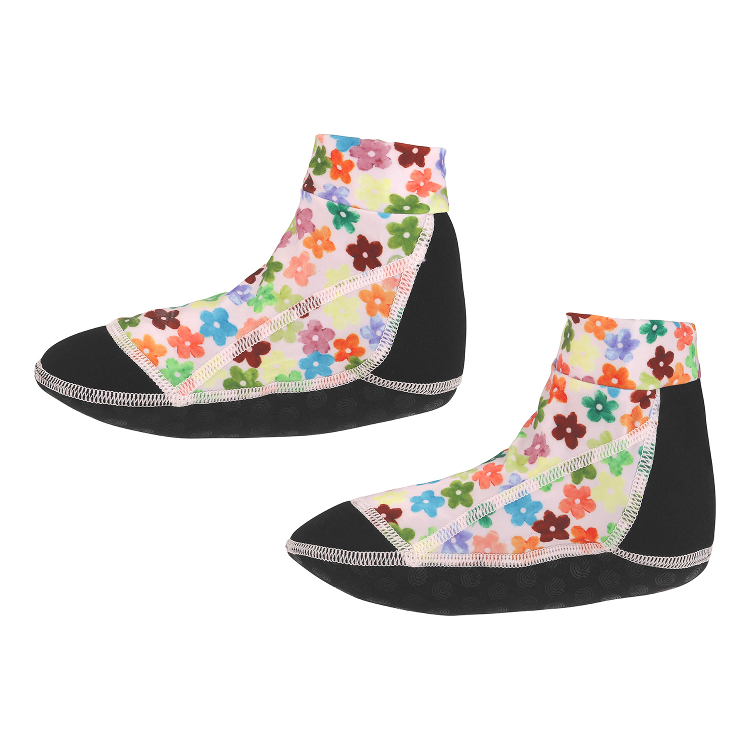 Black aqua socks with a pink floral print. They protect small feet against sharp objects and warm sand. The socks are constructed in recycled, stretchy polyester, which makes them easy to slip on and off. Molo's swimwear has a high level, 50+ UV protection.