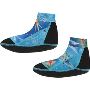 Blue and black aqua socks in an all over marine life print. They protect small feet against sharp objects and warm sand. The socks are constructed in recycled, stretchy polyester, which makes them easy to slip on and off. Molo's swimwear has a high level, 50+ UV protection.