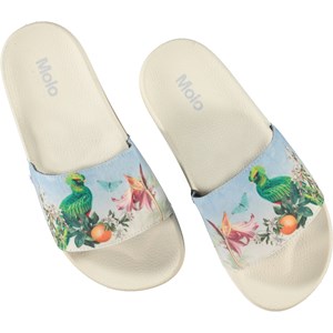 Molo's Zhappy sandals are a must-have for the summer heat when your toes need some air. These slippers are in light blue with a print of tropical birds, fruit and flowers. The sandals have an elastic heel-strap in sizes 23/24 and 25/26