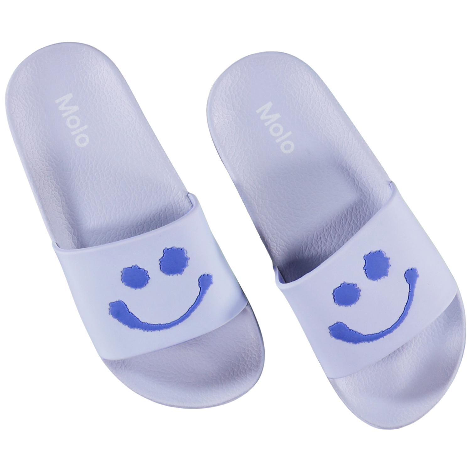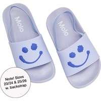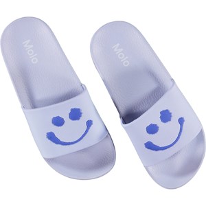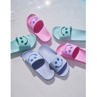 Purple sandals with happy, smiling faces on the front. The sandals are waterproof, so they are perfect to bring to the pool or to the beach.