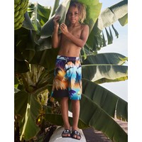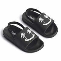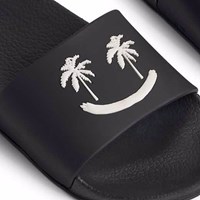 Black sandals with a wide foot strap and molded insole. These sandals are water-resistant, making them perfect for the pool or beach. The foot strap has a smiling face with palm tree eyes in white. Sizes 6.5/7 and 7/8 feature a convenient elastic heel strap for a secure, comfortable fit.
