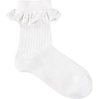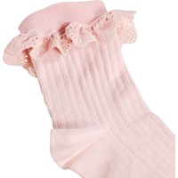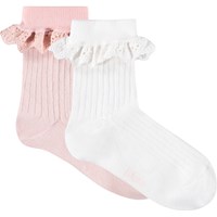 2-pack of fine-knit cotton socks with ribbed shaft and lace edge. The pack contains one pair of pink and one pair of white.