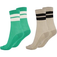 Two pairs of sporty socks in rib. One pair is in green with white stripes and the other is beige with black stripes.
