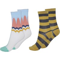 Two pairs socks in rib. One pair is in a floral print and the other is with yellow and black stripes.