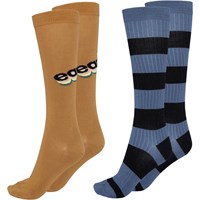 Two pairs of long socks. One pair is in brown with the text 'Equal', while the other pair is blue striped.