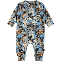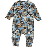 Fairfax is a baby bodysuit with long sleeves and legs with a print of adorable puppies. It has raglan sleeves and an easy snap closure that is slanted at the neck and a snap closure between the legs for quick changes.