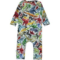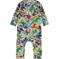 Fleming is a baby bodysuit with long sleeves and legs. It is in light blue and has a print of different animals. It has easy snap closure at the neck and crotch.