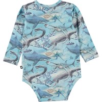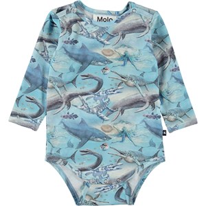 Foss is a blue baby bodysuit with long sleeves in 100% organic cotton jersey. Foss has an easy snap closure at the neck and between the legs. It is in the Ancient Ocean all over print, which shows sharks, octopus and prehistoric aquatic dinosaurs swimming around.