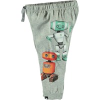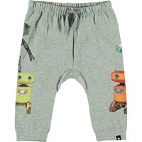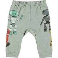 Light grey melange baby trousers with a low crotch. The trousers have an elastic waist with ties and a robot print down the sides. It has a slightly wide elastic edge at the ankles.