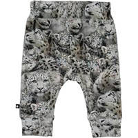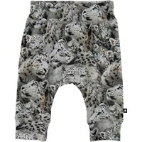 Sammy is pair of grey baby trousers with a print of snow leopards. They have a wide elastic rib at the waist and legs and visible stitching in the front that gives them a sweatpants look.