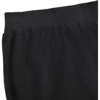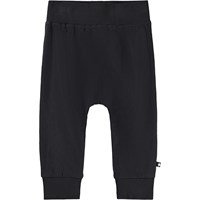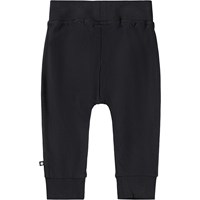 Sammy is a pair of black baby trousers. They have a wide elastic rib at the waist and legs and visible stitching on the front that gives them a sweatpants look.