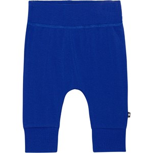 Dark blue baby trousers in organic cotton jersey. They have a wide, elastic rib at the waist and legs as well as visible stitching on the front, which gives them a sweatpants look. The trousers are roomy and easy to move around in.