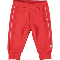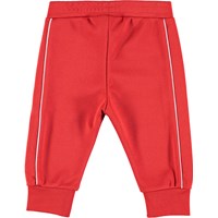 Hip, red baby sweatpants with an elastic waist, white stripes down the legs and rib at the ankles.