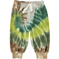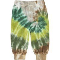 Simeon is a pair of velour baby sweatpants with tie dye print. They have an elastic waist with ties.