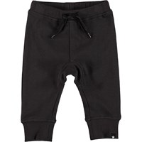 Stan is a pair of loose-fitting, dark brown baby sweatpants in a comfortable fit and with an elastic waist with striped ties. Stan is the perfect pull on pant and has a soft, brushed inner face as well as rib at the legs.