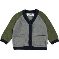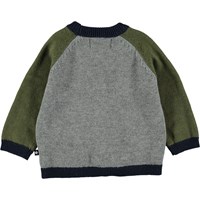 Benjamin is a knit baby cardigan in green and grey with dark blue details. Benjamin has a button closure and small pockets on the front.