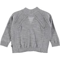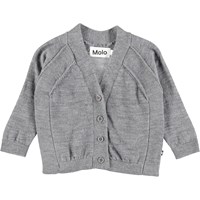 Sweet, finely knit baby cardigan in grey wool with rib edges, visible stitching and buttons down the front.