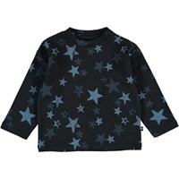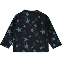 Eki is a blue baby top with a star print. Eki has an easy snap closure on one shoulder.