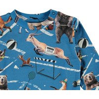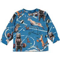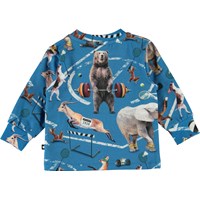 Eloy is a light blue baby top with a print of various animals engaged in sports. Eloy has a snap closure on one shoulder and blue sleeves and back.