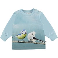 Eloy is a light blue baby top in a print of two birds on the front. Eloy has an easy snap closure on one shoulder.
