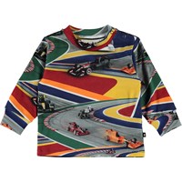 Eloy is a baby top with a print of colourful race cars. Eloy has a snap closure on one shoulder and blue sleeves and back.