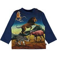 Enovan is a blue baby top in the 'Wild Future' on the front, which shows futuristic wild animals. Can you tell which animals they are descended from? Enovan has a snap closure on one shoulder and with dark blue sleeves and back.