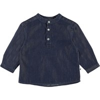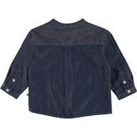 Enoz is a blue denim baby shirt. It has buttons at the collar. There are baby trousers that match the shirt perfectly. .